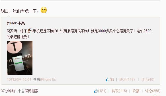 10月27日,羅永浩今日轉發(fā)錘子手機用戶(hù)的微博,表示考慮對手機進(jìn)行降價(jià)。微博用戶(hù)@Mor-小某 昨日發(fā)微博稱(chēng):“錘子手機還是不錯的!試用后感覺(jué)很不錯!就是3000多買(mǎi)個(gè)它感覺(jué)貴了!定價(jià)2600的話(huà)還能接受!”羅永浩今天轉發(fā)了其降價(jià)的微博,并表示:“明白,我們考慮一下。“這可能是錘子手機降價(jià)的信號。